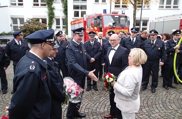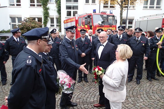 FW-PL: Stellvertretender Feuerwehrchef "Winni" Hüsken und seine Lebensgefährtin Tanja Stüken gaben sich vor dem Standesamt in Plettenberg das Ja-Wort. Großaufgebot der Feuerwehr am Rathaus.