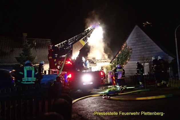 Die Feuerwehr Plettenberg wurde am frühen morgen gegen 01:45 Uhr von der Feuerwehrleitstelle in Lüdenscheid zu einem Dachstuhlbrand in den Ortsteil Köbbinghausen alarmiert. Bei Eintreffen der Feuerwehr stellte sich dieser als ausgedehnter Wohnhausbrand heraus. Im Einsatz befanden sich neben den hauptberuflichen Kräften zwei Löschzüge der ehrenamtlichen Feuerwehr. Verletzt wurde bei dem Brand niemand. Die Einsatzstelle ist zur Brandursachenermittlung nach Beendigung der Löscharbeiten von der Polizei beschlagnahmt.