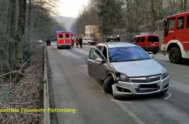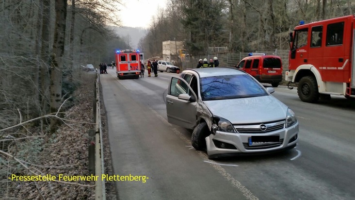 Am Freitagnachmittag kam es in Höhe des Steinbruches Solmbecke zu einem Verkehrsunfall, in dessen Folge einer der Fahrzeuginsassen leicht verletzt wurde. Gegen 17:20 Uhr wurden daraufhin von der Kreisleitstelle in Lüdenscheid die ehrenamtlichen Kräfte der Löschgruppe Selscheid, sowie ein Rettungswagen der Feuerwache am Wall alarmiert. Zwei PKW waren in Höhe des Steinbruches offenbar kollidiert, wobei eines der Fahrzeuge nach der Kollision von der Fahrbahn abkam und gegen eine Uferböschung prallte. Zunächst galt es für die Feuerwehrkräfte aus Selscheid die Unfallstelle, sowie die Fahrzeuge abzusichern und den leicht Verletzten Fahrzeuginsassen bis zum Eintreffen des Rettungsdienstes zu versorgen. Der Verletzte wurde im Anschluss vom Rettungswagen zur weiteren Behandlung dem Plettenberger Krankenhaus zugeführt. Da aus einem der verunfallten und nicht mehr fahrbereiten PKW Betriebsmittel ausliefen, mussten diese von der Feuerwehr mit Bindemittel abgebunden und im Anschluss beseitigt werden. Nach knapp einer Stunde konnte die Feuerwehr wieder in ihren Standort einrücken. Zu Unfallursache und Schadenshöhe kann die Feuerwehr keine Auskunft erteilen.
