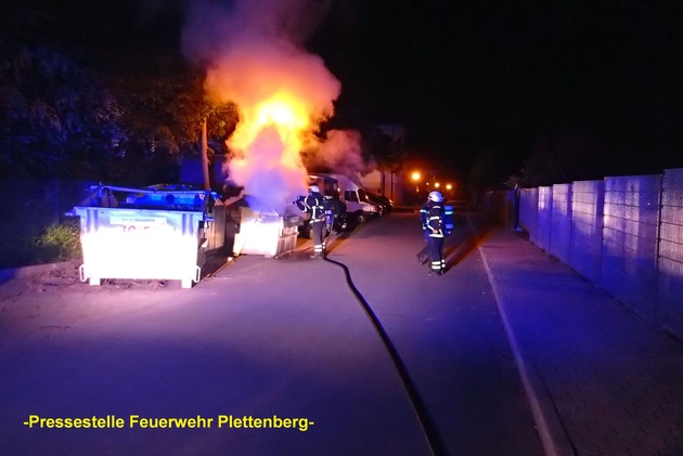 Gegen 23:35 Uhr mussten gestern Abend die hauptberuflichen Kräfte der Wache am Wall zu einem Müllcontainerbrand in die Bludenzer Straße ausrücken. Bei Eintreffen der Feuerwehr schlugen die Flammen bereits meterhoch aus einem Altpapiercontainer. Der Brand konnte durch einen Löschangriff unter schwerem Atemschutz schnell unter Kontrolle gebracht und somit ein Übergreifen des Brandes auf weitere Container, sowie geparkte Fahrzeuge verhindert werden. Polizei und Feuerwehr gehen in diesem Fall von Brandstiftung aus. Die Polizei ermittelt in diesem Fall und bittet Zeugen, welche in diesem Zeitraum Auffälligkeiten in diesem Bereich bemerkt haben, sich in der Polizeidienststelle in Plettenberg unter der Rufnummer 02391/9199-0 zu melden.