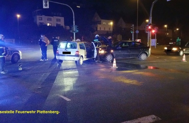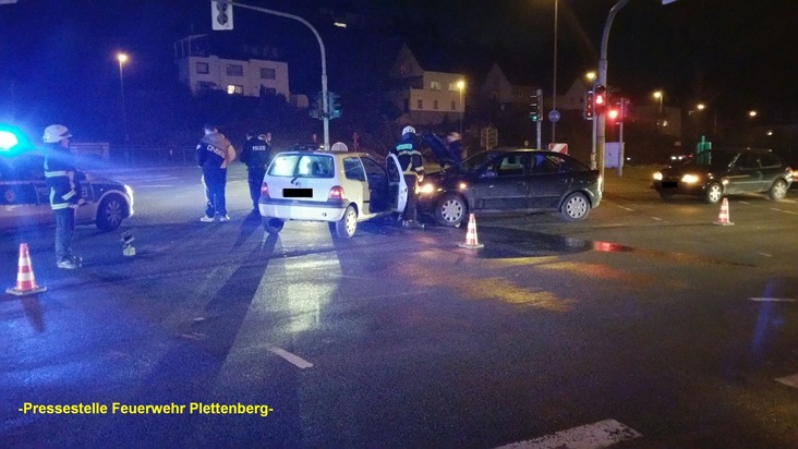 Kurz nach 21:00 Uhr wurden gestern Abend die hauptberuflichen Kräfte der Feuer- und Rettungswache zu einem Verkehrsunfall im Kreuzungsbereich Westtangente/Böddinghauser Weg, dem sogenannten "Lennekreuz" alarmiert. Zwei PKW waren dort kollidiert, wobei eine Person leicht verletzt und per Rettungswagen dem Plettenberger Krankenhaus zugeführt wurde. Die Feuerwehr sicherte die Unfallstelle und unterstützte bei den Rettungs- und Bergungsarbeiten. Zum genauen Unfallhergang und zur Sachschadenshöhe kann die Feuerwehr keine Auskunft erteilen. Gegen 23:20 Uhr wurden die hauptberuflichen Kräfte der Feuerwache und die ehrenamtliche Einheit der Löschgruppe Stadtmitte zu einem Industriebetrieb in die Königstraße gerufen. Mitarbeiter des Betriebes hatten an einer Produktionsanlage einen Entstehungsbrand bemerkt, worauf eine Löschanlage ausgelöst und eine unmittelbare Evakuierung veranlasst wurde. Per Notruf wurde die Feuerwehr alarmiert. Diese kontrollierte unter Atemschutz den Bereich der Anlage, musste allerdings keine Löschmaßnahmen mehr einleiten. Verletzt wurde niemand. Zur Sachschadenshöhe kann die Feuerwehr keine Auskunft erteilen. Bereits nach einer halben Stunde konnten die Einsatzkräfte wieder in ihre Standorte einrücken.