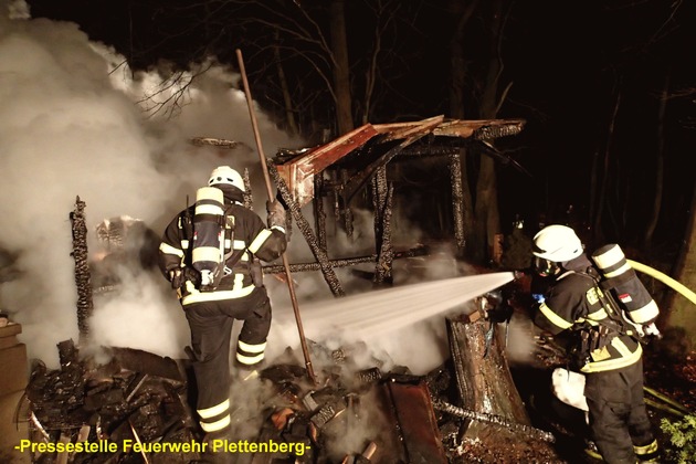 Gegen 00:00 Uhr wurde am heutigen Dienstagmorgen der Leitstelle in Lüdenscheid der Brand eines als Wochenendhaus genutztes Gebäude im Waldgebiet Plettenberg-Grävinglöh gemeldet. Aufgrund der Meldung wurden die hauptberufliche Wachbereitschaft und die ehrenamtlichen Einsatzkräfte der Löscheinheiten aus Holthausen, Ohle und Selscheid alarmiert. Bei Eintreffen der Feuerwehr brannte das etwa 40 Quadratmeter große aus Holz bestehende Gebäude bereits in ganzer Ausdehnung. Der Bewohner des Hauses hatte eigenen Angaben zur Folge das Haus kurzzeitig verlassen, welches nach dessen Rückkehr bereits in Brand geraten war. Er blieb zum Glück unverletzt und wurde zunächst von der Rettungswagenbesatzung mit einer wärmenden Decke versorgt und betreut. Mit mehreren Löschrohren unter schwerem Atemschutz wurde eine umfangreiche Brandbekämpfung eingeleitet. Schwierigkeit für die Feuerwehr hierbei, da die Einsatzstelle mitten in einem Waldgebiet lag, musste mit Hilfe der Löschwassertanks der Löschfahrzeuge das Wasser per sogenannten "Pendelverkehr" herangeführt werden. Getankt wurden hierzu die Löschfahrzeuge aus einem knapp 3 Kilometer entfernten leistungsfähigen Hydranten im Industriegebiet Köbbinghauser Hammer. Hierbei bezahlt gemacht hatte sich, dass die Plettenberger Löschfahrzeuge mit entsprechend großen Wassertanks ausgestattet sind. Über drei Stunden benötigte die Feuerwehr mit Brandbekämpfung und Nachlöscharbeiten des bis auf die Grundmauern niedergebrannten Gebäudes. Zur Brandursache, sowie zur Sachschadenshöhe kann die Feuerwehr keine Auskunft erteilen.