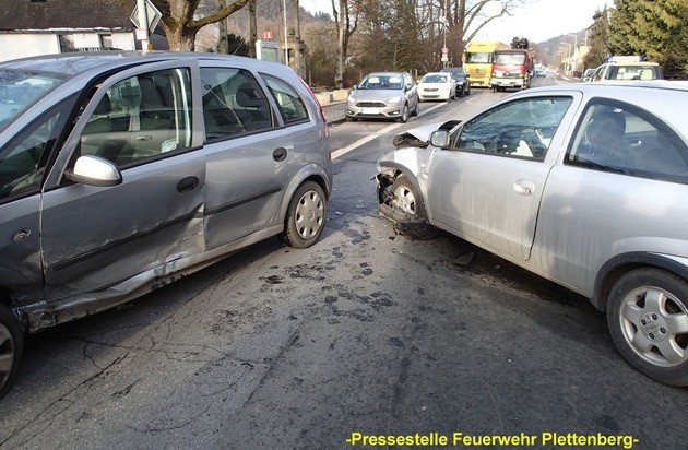 Mit dem Stichwort "eingeklemmte Personen nach Verkehrsunfall" alarmierte die Feuerwehrleitstelle am Freitagmorgen gegen 09:50 Uhr alle Kräfte der hauptberuflichen Wache inklusive beider Rettungswagen, Notarzt und Führungsdienst, sowie den Rüstzug der ehrenamtlichen Kräfte aus Ohle und die Löschgruppe Eiringhausen. Im Kreuzungsbereich Lennestraße/Nordstraße/Alter Weg kam es auf der B236 ersten Angaben zur Folge bei einem Abbiegevorgang zu einer Kollision zweier PKW, dessen insgesamt drei Fahrzeuginsassen dabei verletzt wurden. Die Ersteintreffende Besatzung des Rüstwagens aus Ohle konnte zunächst insofern Entwarnung geben, als das keiner der Fahrzeuginsassen eingeklemmt war. Dennoch galt es von der Feuerwehr zwei der drei Insassen zu versorgen und die Fahrzeuge zu sichern. So musste der Brandschutz sichergestellt, auslaufende Betriebsstoffe aufgenommen und Fahrzeugbatterien abgeklemmt werden. Eine der Verletzten wurde in einer direkt an der Unfallstelle gelegenen Arztpraxis erstversorgt. Ein weiterer Rettungswagen aus Werdohl wurde nachgefordert und die Patienten mit Verdacht auf eher leichtere bis mittelschwere Verletzungen nach notärztlicher Sichtung und Behandlung dem Plettenberger Krankenhaus zugeführt. Zum genauen Unfallhergang und zur Sachschadenshöhe kann die Feuerwehr keine Auskunft erteilen. Während der Rettungs- und Bergungsarbeiten, sowie zur Unfallaufnahme durch die Polizei musste die B 236 voll gesperrt werden.