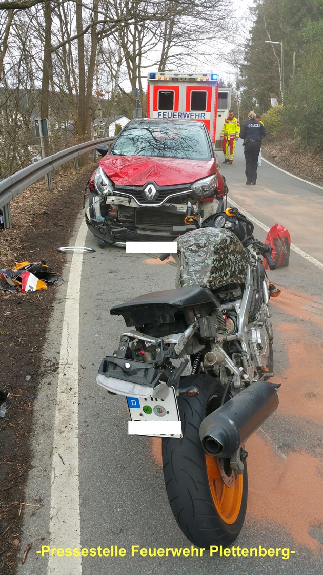 FW-PL: OT-Eiringhausen. Frontalzusammenstoss Krad gegen PKW. Zwei Verletzte.