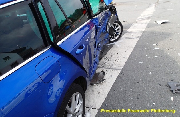 Gegen 11:30 Uhr kam es am gestrigen Samstagmittag während eines Abbiegevorgangs im Bereich Osterloh/Köbbinghauser Hammer zu einer Kollision zweier PKW. Bei dem Unfall wurden zum Glück die vier Insassen, darunter auch ein Kleinkind, vermutlich eher leicht verletzt und nach notärztlicher Sichtung zur genaueren Untersuchung einem Krankenhaus zugeführt. "Sehr wahrscheinlich haben die passiven Sicherheitseinrichtungen der Fahrzeuge dafür gesorgt, dass keiner ernsthaft verletzt wurde", so ein Sprecher der Plettenberger Feuerwehr. Die zahlreichen Airbags, welche im Innenraum der Fahrzeuge ausgelöst hatten, sorgten für die Absorbierung der erhöhten Aufprallenergie. "Dennoch ist der menschliche Körper, insbesondere die inneren Organe, durch die schlagartige Energie hohen Kräften ausgesetzt und sollte deshalb nachträglich einer fachärztlichen Untersuchung bedürfen", so der Sprecher weiter. Die Kräfte der hauptamtlichen Wache, welche unter anderem mit beiden Rettungswagen und Notarzt zur Einsatzstelle ausgerückt waren, sicherten die Einsatzstelle während der Rettungs- und Bergungsarbeiten sowie zur Unfallaufnahme durch die Polizei ab und nahmen auslaufende Betriebsmittel auf. Zum genauen Unfallhergang und zur Sachschadenshöhe kann die Feuerwehr keine Auskunft erteilen.