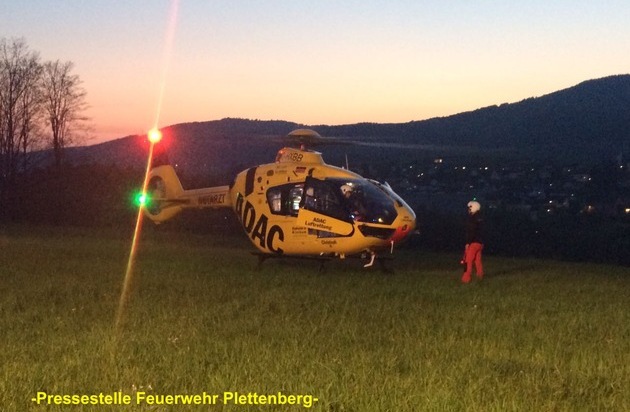 Zu einem schweren Radunfall im Waldgebiet oberhalb dem Bruchweg in Holthausen, wurden am Mittwochabend gegen 20:40 Uhr die Rettungskräfte der Plettenberger Feuer- und Rettungswache alarmiert. Ein Radfahrer war ersten Informationen zur Folge schwer gestürzt, wobei nach notärztlicher Untersuchung der Verdacht bestand, dass er sich dabei mehrere zum Teil schwerste Verletzungen zuzog. Der Rettungshubschrauber Christoph 25 aus Siegen wurde angefordert, welcher nach Absicherung eines geeigneten Landeplatzes durch die hauptberufliche Wachbereitschaft auf einer geeigneten Wiese zwischen Dingeringhauser Weg und Bruchweg zur Landung ging. Aufgrund der Dämmerung wurde der Landeplatz zusätzlich von der Feuerwehr umfangreich ausgeleuchtet. Der Verletzte wurde mit dem Helikopter einer geeigneten Fachklinik in Siegen zugeführt. Zum Unfallhergang kann die Feuerwehr keine Auskunft erteilen.