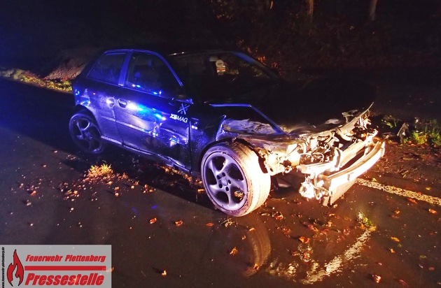 Glück im Unglück hatte ein 19-jähriger Autofahrer am Samstagabend bei einem Alleinunfall auf der Kreisstraße 5 von Landemert kommend in Richtung Plettenberg oberhalb der Ortslage Heveschotten. Trotz seines rundum schwer demolierten Fahrzeuges konnte er unverletzt aus seinem Fahrzeug aussteigen. Nach Aussage der Polizei vermutlich aufgrund von unangepasster Geschwindigkeit bei herbstlich nassen Straßenverhältnissen kam das Fahrzeug nach einer langgezogenen Rechtskurve von der Fahrbahn ab, querte die Gegenfahrbahn, kollidierte dort mit der Leitplanke, rutschte erneut über die Gegenfahrbahn und kam entgegengesetzt der ursprünglichen Fahrtrichtung zum Stehen. Hierbei wühlte das Fahrzeug auf rund 50 Metern Länge reichlich Erdreich aus der Bankette auf, zudem übersäten Trümmerteile die Fahrbahn. Gegen 21:50 Uhr wurden am späten Samstagabend die Kräfte der Plettenberger Feuer- und Rettungswache von der Polizei um Amtshilfe gebeten. Die Unfallstelle wurde von der Feuerwehr zunächst umfangreich ausgeleuchtet, bevor die stark verunreinigte Straße durch Vornahme eines Löschrohres des Hilfeleistungslöschfahrzeuges gereinigt werden konnte. Hierzu wurde die Kreisstraße 5 oberhalb Heveschotten für knapp eine Viertelstunde voll gesperrt. Der PKW war nicht mehr fahrbereit und musste abgeschleppt werden.