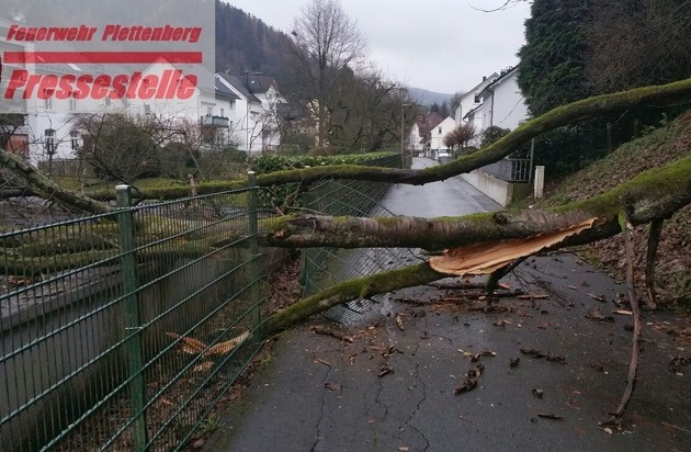 Am heutigen Sonntagmorgen kurz vor 08:00 Uhr fiel ein Baum aus einer Uferböschung auf die Weidenstraße sowie eine angrenzende Garage und eine Zaunanlage. Die hauptamtliche Wachbereitschaft der Plettenberger Feuerwehr rückte aus und beseitigte den Baum mit Hilfe einer Motorsäge. Zum Glück waren weder Fahrzeuge noch Fußgänger auf dem kombinierten Fahr- und Fußweg unterwegs, weshalb niemand verletzt wurde. Zur Höhe des entstandenen Sachschadens kann die Feuerwehr keine Auskunft erteilen.