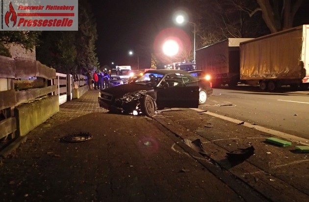 Am Dienstagabend gegen 20:30 Uhr wurden Rettungskräfte von Polizei und Plettenberger Feuerwehr zu einem Verkehrsunfall in die Lennestraße gerufen. Dort war es zu einer Kollision zwischen einem fahrenden und einem auf dem Seitenstreifen geparkten PKW gekommen. Durch den Aufprall wurde der stehende PKW fast 15 Meter herumgeschleudert, bevor beide Fahrzeuge völlig demoliert zum Stehen kamen. Eine Person wurde verletzt und musste per Rettungswagen dem Plettenberger Krankenhaus zugeführt werden. Auch ein Hund, welcher in einer Transportbox im stehenden PKW saß, wurde verletzt und umgehend von dessen Besitzerin zu einem Veterinär gebracht. Glück im Unglück für die Insassin des stehenden PKW, welche sich noch für Umzugsvorbereitungen in einem benachbarten Wohnhaus befand, diese kam mit einem gehörigen Schrecken davon. Die Feuerwehr nahm auslaufende Betriebsstoffe auf und leuchtete die Unfallstelle mit Scheinwerfern umfangreich aus. Zur Unterstützung bei der Unfallaufnahme der Polizei wurde die Drehleiter nachgefordert, um Lichtbildaufnahmen von oben auf die gesamte Unfallstelle zur Rekonstruktion des Unfallherganges machen zu können. Fast drei Stunden musste die Bundesstraße 236 zwischen Werdohl und Plettenberg für die Rettungs- und Bergungsarbeiten sowie zur Unfallaufnahme zeitweise voll gesperrt werden. Es kam zu erheblichen Rückstaus. Zum Unfallhergang und zur Höhe des entstandenen Sachschadens kann die Feuerwehr keine Auskunft erteilen.