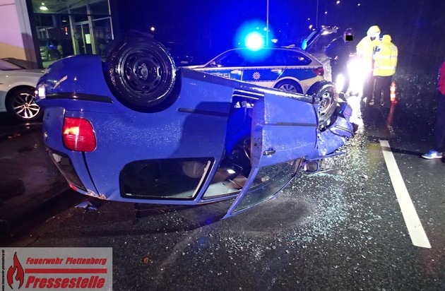 FW-PL: OT-Stadtmitte. PKW überschlägt sich in der Bahnhofstraße. Fahrer wird verletzt.