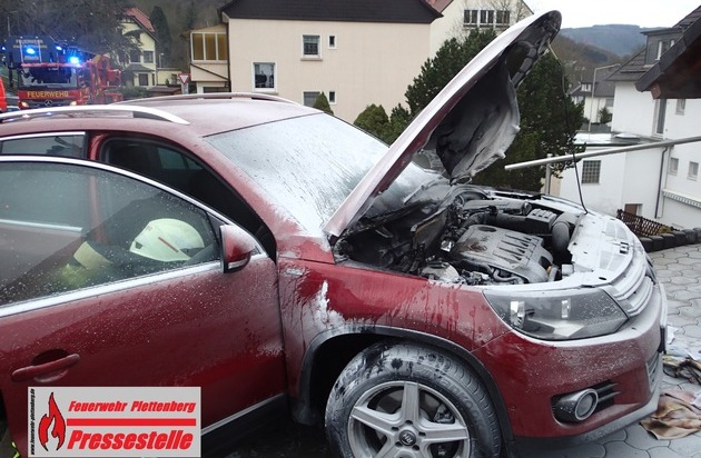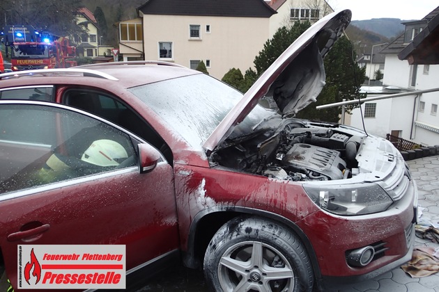 Ein PKW-Fahrer stellte am heutigen Vormittag seinen VW Tiguan auf seinem Privatgrundstück an der Lehmkuhler Straße ab. Cirka 15 Minuten später bemerkten die Hausbewohner, dass Flammen und Rauch aus dem Motorraum des Fahrzeuges drangen. Umgehend informierten diese über den Notruf 112 die Rettungsleitstelle in Lüdenscheid. Um 10:43 wurden die Kräfte der Feuer- und Rettungswache mit dem Einsatzstichwort "Fahrzeugbrand" alarmiert. Mit einem Feuerlöscher gelang es dem Besitzer, bis zum Eintreffen der Feuerwehr die Flammen soweit einzudämmen, dass sich der Brand nicht weiter ausdehnen und so auf einen neben dem Fahrzeug abgestellten Wohnanhänger übergreifen konnte. Ein Atemschutztrupp der Feuerwehr nahm ein Löschrohr vor und kontrollierte abschließend mit einer Wärmebildkamera um Glutnester auszuschließen. Nach 30 Minuten rückte die Feuerwehr wieder in ihren Standort ein. Über die Schadenshöhe kann die Feuerwehr keine Auskunft geben.