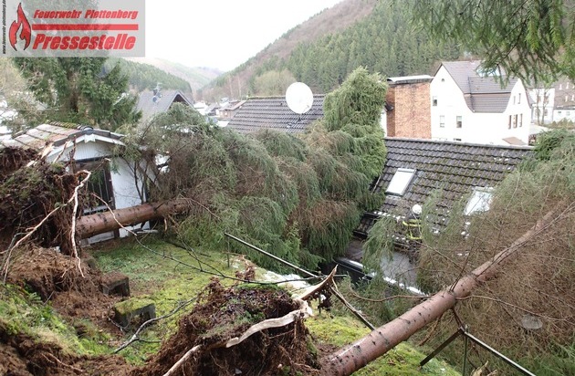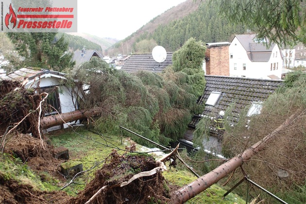 Knapp über 30 Einsätze haben die Kräfte der Plettenberger Feuerwehr bisher abgearbeitet. Menschen oder Tiere kamen bisher zum Glück nicht zu Schaden. Dennoch gibt es Sachschäden in noch unbekannter Höhe. In den Ortsteilen Holthausen und im Oestertal wurden Gebäude und Fahrzeuge zum Teil erheblich beschädigt. Auch sonst gab es abgedeckte Dächer und umgestürzte Bäume. Zurzeit werden die gesperrten Straßen begutachtet, ob und in wie weit die Feuerwehr überhaupt tätig werden kann oder muss. Im Oestertal kippten zwei große Bäume auf ein Wohngebäude. Samt Wurzelteller fielen die Bäume, vermutlich begünstigt durch den Sturm, auf das Wohnhausdach. Die Einheit Oestertal und die Drehleiter der Feuer- und Rettungswache sind dort zurzeit noch vor Ort.