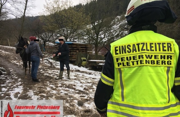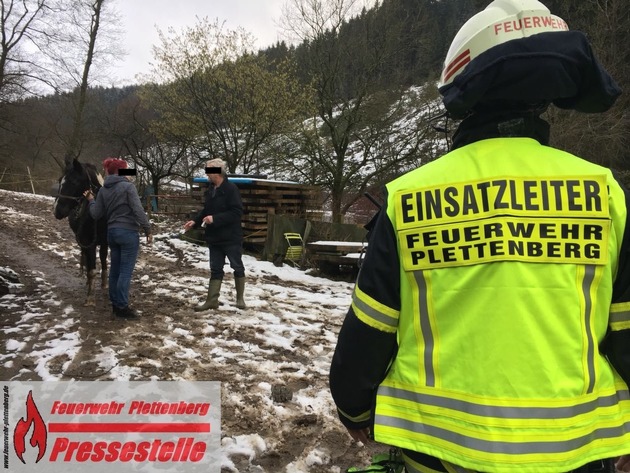 Kurz vor 15:00 Uhr wurde der Feuer- und Rettungsleitstelle des Märkischen Kreises eine Tiernotlage im Ortsteil Steinkuhle gemeldet. Ein Pferd sei laut Anrufer kopfüber eine Böschung hinabgerutscht. Mit dem Alarmstichwort "Tier in Notlage" wurden daraufhin die Kräfte der Plettenberger Feuer- und Rettungswache alarmiert. Bei Eintreffen der Feuerwehr lag das Pferd rücklinks in einer steilen Uferböschung zwischen kleineren Bäumen. Die 24-jährige Stute war offensichtlich aufgrund der nassen und schneebedeckten Wiese ausgerutscht. Es drohte ein Kreislaufversagen, weshalb umgehend ein Veterinär verständigt wurde. Zur Sicherung des Pferdes wurden Bandschlingen und tragbare Leitern vom Hilfeleistungslöschfahrzeug herangeführt. Zusätzlich wurde die Löschgruppe Landemert zur Unterstützung nachalarmiert. Ein an der Unfallstelle befindlicher Landwirt konnte mit seinem Traktor und daran angebrachter Seilwinde ca. 20 Meter oberhalb der Wiese auf einem Wald- und Wirtschaftsweg postiert werden. So konnte das Pferd durch Anbringen der Bandschlingen per Seilwinde an den Vorderläufen vorsichtig aus der Böschung gezogen werden. "Wir hatten keine andere Möglichkeit, es galt keine Zeit zu verlieren, denn das Pferd verdrehte schon die Augen und drohte sein Bewusstsein zu verlieren", so ein Sprecher der Feuerwehr. Vorsichtig wurde das Pferd von den Einsatzkräften, dem Besitzer sowie dessen Tochter mit Lebensgefährten in eine günstige Position gedreht. Nach ein paar Minuten Erholung stand die Stute "Beauty" unversehrt wieder auf und konnte auf sicheren Untergrund geführt werden. Auch der hinzugerufene Tierarzt aus Plettenberg bescheinigte Besitzern und Feuerwehr einen schadlosen Verlauf und lobte den erfolgreichen Rettungseinsatz.
