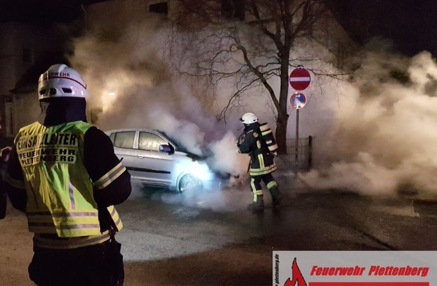 Gegen 05:45 Uhr geriet am heutigen Freitagmorgen vermutlich aufgrund eines technischen Defektes ein PKW in der Theobald-Pfeiffer-Straße im Ortsteil Ohle in Brand. Bei Eintreffen der von der Feuer- und Rettungsleitstelle des Märkischen Kreises alarmierten Einsatzkräfte der Plettenberger Feuer- und Rettungswache brannte der Motorraum in ganzer Ausdehnung und konnte durch Vornahme eines Löschrohres kurzerhand abgelöscht werden. Anfängliche Meldungen über eine direkte Nähe des brennenden Fahrzeuges zu einem Wohngebäude bestätigten sich zum Glück nicht. Die Gefahr eines Übergreifens auf ein Wohnhaus bestand zu keiner Zeit, so ein Sprecher der Feuerwehr. Bereits nach 20 Minuten konnten die Wehrleute wieder einrücken. Zur Höhe des entstandenen Sachschadens kann die Feuerwehr keine Auskunft erteilen.