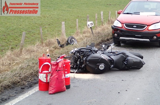 Kurz vor 16:00 Uhr wurden am heutigen Samstagnachmittag Rettungskräfte von Plettenberger Feuerwehr und Polizei zu einem schweren Verkehrsunfall auf der B236 zwischen den Ortsteilen Teindeln und Ohle gerufen. Ein Motorradfahrer war mit seinem Krad auf einer langen Geraden aus noch nicht geklärter Ursache gestürzt und hatte sich dabei schwerste Verletzungen zugezogen. Aufgrund der Schwere seiner Verletzungen wurde zusätzlich ein Rettungshubschrauber (Christoph 8 aus Lünen) angefordert, welcher den Verletzten noch von der Unfallstelle in eine entsprechende Klinik nach Dortmund verbrachte. Die Besatzung der Feuerwache unterstützte bei den Rettungs- und Bergungsarbeiten sowie bei der umfangreichen Unfallaufnahme durch die Polizei. Die Bundesstraße blieb für gut zweieinhalb Stunden komplett für den Verkehr gesperrt. Zu Unfallursache und Sachschadenhöhe kann die Feuerwehr keine Auskunft erteilen.