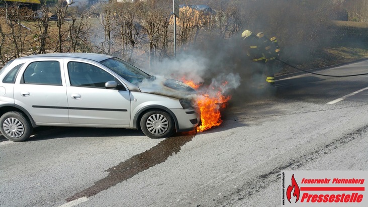 Gegen 12:50 Uhr rückte am heutigen Donnerstagmittag die Plettenberger Feuerwehr zu einem Fahrzeugbrand in der Affelner Straße aus. Eine PKW-Fahrerin war mit ihrem Fahrzeug von der Hallenschule losgefahren, als nach kurzer Fahrt plötzlich Flammen aus dem Bereich der Motorhaube schlugen. Bei Eintreffen der Feuerwehr brannte der Motorraum bereits in ganzer Ausdehnung. Mit einem Löschrohr unter Atemschutz konnte der Brand kurzerhand von den Wehrleuten abgelöscht werden. Anschließend mussten noch auslaufende Betriebsstoffe aufgenommen werden, bevor das nicht mehr fahrbereite Fahrzeug abgeschleppt wurde. Die Feuerwehr vermutet einen technischen Defekt als Ursache. Zur Sachschadenhöhe kann die Feuerwehr keine Auskunft erteilen. Verletzt wurde niemand.