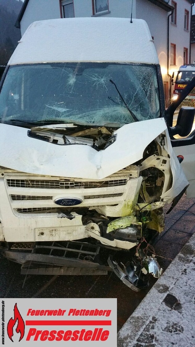 Am heutigen Dienstagmorgen gegen 05:45 Uhr kam es zu einer Kollision von zwei Fahrzeugen auf dem Brockhauser Weg in der Einmündung zur Brandenbergstraße. Ein Kleintransporter kam nach dem Zusammenprall von der Fahrbahn ab und anschließend in einer Zaunanlage sowie einem Verkehrsschild zum Stehen. Diesem Umstand sei es zu verdanken, dass das Fahrzeug nicht eine Uferböschung hinabstürzte, so ein Sprecher der Plettenberger Feuerwehr. Die alarmierten Kräfte der Feuer- und Rettungswache unterstützten bei den Rettungs- und Bergungsarbeiten sowie der Unfallaufnahme durch die Polizei und verbrachten eine Person zur genaueren Diagnostik nach notärztlicher Erstversorgung per Rettungswagen mit dem Verdacht auf schwere Verletzungen in das Plettenberger Krankenhaus. Zur Höhe des entstandenen Sachschadens und zum genauen Unfallhergang kann die Feuerwehr keine Auskunft erteilen.