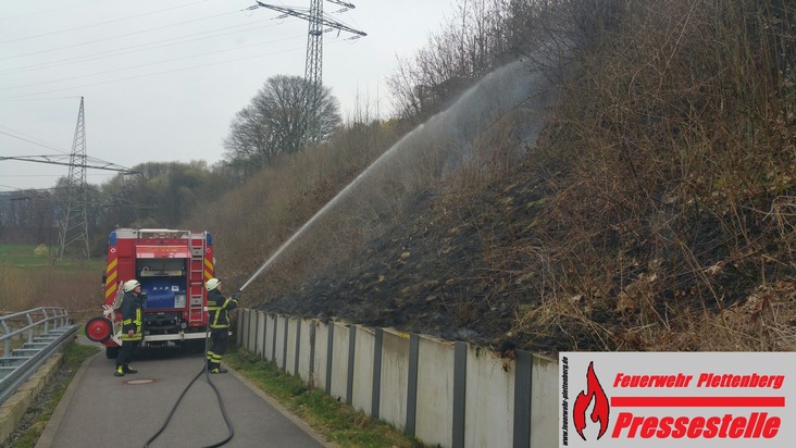 Gleich drei Einsätze in Folge musste die Plettenberger Feuerwehr am heutigen Nachmittag abarbeiten. Um 15:20 Uhr wurde der Feuerwehr der Brand eines Böschungshanges an einem Fuß- und Radweg in der Papenkuhle in Nähe zum Lennegewässer gemeldet. Bei Eintreffen der Feuerwehr brannte eine Fläche von ca. 80 Quadratmetern an einem steilen Hang. Durch Vornahme von zwei Löschrohren konnten die alarmierten Einsatzkräfte der Einheiten von Feuerwache und Ohle den Brand schnell unter Kontrolle bringen. Zur Brandursache und Höhe des entstandenen Sachschadens kann die Feuerwehr keine Auskunft erteilen. Just als die Einsatzkräfte ihre Gerätschaften zurückgenommen hatten, folgten kurz vor 16:00 Uhr zwei weitere Paralleleinsätze. Während der Rüstzug aus Ohle zu einem Hilfeleistungseinsatz am Plettenberger Bahnhof abkommandiert wurde, mussten die Kräfte der Feuerwache inklusive Führungsdienst und der Einheit Stadtmitte zu einem ausgelösten Heimrauchmelder mit bestätigter Rauchentwicklung aus einem Wohnungsfenster in den Landemerter Weg ausrücken. Bei Eintreffen der Einsatzkräfte am Landemerter Weg konnte durch rasches Eingreifen der Feuerwehr sicherlich größerer Schaden vermieden werden. Nachdem sich die Feuerwehr Zugang zur Wohnung verschafft hatte, konnte eine auf einem eingeschalteten Herd vergessene Espressokanne ins Freie verbracht werden. Die verrauchte Wohnung wurde von der Feuerwehr anschließend quergelüftet. Der Mieter war nicht zu Hause und wird im Nachgang durch die Polizei über den Feuerwehreinsatz informiert. Zur Höhe des entstandenen Sachschadens kann auch hier die Feuerwehr keine Auskunft erteilen. Am Plettenberger Bahnhof stand eine 24-jährige auf dem Bahnsteig mit ihrem 125 kg schweren Rollstuhl hilflos vor einem defekten Aufzug und konnte somit nicht in die Bahnhofsunterführung gelangen. Die Mutter verständigte daraufhin die Feuerwehr. Die Einsatzkräfte forderten zunächst einen Rettungswagen an, um die junge Frau per auf dem Fahrzeug mitgeführten Tragestuhl über den Treppenabgang in die Unterführung zu tragen. Für den 125 kg schweren Rollstuhl wurde mit Hilfe von Unterbaumaterial aus dem Rüstwagen eine provisorische Rampe gebaut, um das Gefährt sicher in die Unterführung zu verbringen. Hier wurde die Frau wieder in ihren Rollstuhl zurück gesetzt und konnte den Bahnhof über den Zugang zur Breddestraße anschließend wieder verlassen.