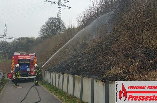 Gleich drei Einsätze in Folge musste die Plettenberger Feuerwehr am heutigen Nachmittag abarbeiten. Um 15:20 Uhr wurde der Feuerwehr der Brand eines Böschungshanges an einem Fuß- und Radweg in der Papenkuhle in Nähe zum Lennegewässer gemeldet. Bei Eintreffen der Feuerwehr brannte eine Fläche von ca. 80 Quadratmetern an einem steilen Hang. Durch Vornahme von zwei Löschrohren konnten die alarmierten Einsatzkräfte der Einheiten von Feuerwache und Ohle den Brand schnell unter Kontrolle bringen. Zur Brandursache und Höhe des entstandenen Sachschadens kann die Feuerwehr keine Auskunft erteilen. Just als die Einsatzkräfte ihre Gerätschaften zurückgenommen hatten, folgten kurz vor 16:00 Uhr zwei weitere Paralleleinsätze. Während der Rüstzug aus Ohle zu einem Hilfeleistungseinsatz am Plettenberger Bahnhof abkommandiert wurde, mussten die Kräfte der Feuerwache inklusive Führungsdienst und der Einheit Stadtmitte zu einem ausgelösten Heimrauchmelder mit bestätigter Rauchentwicklung aus einem Wohnungsfenster in den Landemerter Weg ausrücken. Bei Eintreffen der Einsatzkräfte am Landemerter Weg konnte durch rasches Eingreifen der Feuerwehr sicherlich größerer Schaden vermieden werden. Nachdem sich die Feuerwehr Zugang zur Wohnung verschafft hatte, konnte eine auf einem eingeschalteten Herd vergessene Espressokanne ins Freie verbracht werden. Die verrauchte Wohnung wurde von der Feuerwehr anschließend quergelüftet. Der Mieter war nicht zu Hause und wird im Nachgang durch die Polizei über den Feuerwehreinsatz informiert. Zur Höhe des entstandenen Sachschadens kann auch hier die Feuerwehr keine Auskunft erteilen. Am Plettenberger Bahnhof stand eine 24-jährige auf dem Bahnsteig mit ihrem 125 kg schweren Rollstuhl hilflos vor einem defekten Aufzug und konnte somit nicht in die Bahnhofsunterführung gelangen. Die Mutter verständigte daraufhin die Feuerwehr. Die Einsatzkräfte forderten zunächst einen Rettungswagen an, um die junge Frau per auf dem Fahrzeug mitgeführten Tragestuhl über den Treppenabgang in die Unterführung zu tragen. Für den 125 kg schweren Rollstuhl wurde mit Hilfe von Unterbaumaterial aus dem Rüstwagen eine provisorische Rampe gebaut, um das Gefährt sicher in die Unterführung zu verbringen. Hier wurde die Frau wieder in ihren Rollstuhl zurück gesetzt und konnte den Bahnhof über den Zugang zur Breddestraße anschließend wieder verlassen.
