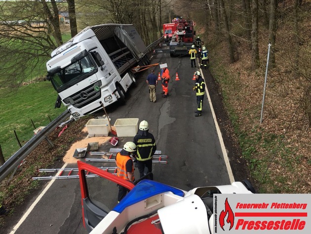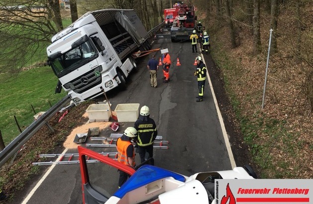 FW-PL: Plettenberger Feuerwehr bei Einsatz in Herscheid. LKW-Unfall nach Ausweichmanöver. Knapp 900 Liter drohten auszulaufen. Bergung des Sattelzuges kompliziert. L696 voll gesperrt.