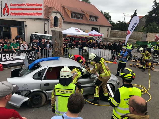Seit 2012 nimmt die Plettenberger Feuerwehr mit einem Spezialteam an den Meisterschaften in der Unfallrettung teil. Das sogenannte TRT-Team (Technical Rescue Team), welches aus ehrenamtlichen Mitgliedern der Einheit des Rüstzuges aus Plettenberg-Ohle besteht, reiste am vergangenen Freitag nach Kölleda in Thüringen. Hier fand die Rescue Challenge 2018, die deutschen Meisterschaften in der Verkehrsunfallrettung von Freitag bis Sonntag statt. 19 Teams aus haupt- und ehrenamtlichen Feuerwehren traten hierbei im Wettbewerb gegeneinander an. In diesem Wettbewerb mussten die Teams unterschiedliche Einsatzszenarien, welche realistisch dargestellt einer Verkehrsunfallsituation mit eingeklemmten Personen sehr ähnlich waren, abarbeiten. In den Standard-Szenarien mussten dabei immer sechs Retter einen noch kreislaufstabilen Patienten innerhalb von 20 Minuten mit Hilfe von hydraulischem Rettungsgerät aus seinem Fahrzeug befreien. Des Weiteren gab es auch sogenannte Rapid-Szenarien (rapid engl., bedeutet schnell), bei denen ein kreislaufinstabiler Patient in einer schnellen Rettung innerhalb von 10 Minuten aus seinem Fahrzeug befreit sein musste. Kritisch bewertet wurden diese Übungsszenarien von Wertungsrichtern, welche aus in der Notfall- und Unfallrettung tätigen Ärzten, erfahrenen Feuerwehr- und Rettungsdienstkräften sowie Ausbildern bestehen. Garvin Pestka als Einheitsführer der Ohler Feuerwehrleute betonte dabei, dass es vielmehr Ziel der Plettenberger sei, durch die Vernetzung mit den anderen Teams bei diesem Wettbewerb Erlerntes umzusetzen und dabei Neuerungen für den Einsatzalltag aufzugreifen, als weniger darum unbedingt einen der ersten drei Plätze in diesem Wettbewerb zu belegen. Die Ohler legen hierbei auch viel Wert darauf, dass auch möglichst alle Mitglieder der Löschgruppe die Gelegenheit dazu bekommen, früher oder später an diesen Wettbewerben teilzunehmen. Auf diesem Wege möchte sich das Ohler Einsatzteam bei seinen Unterstützern bedanken, welche regelmäßig Unfall- oder Altfahrzeuge zur Verfügung stellen, ohne diese ein Üben für diesen Wettbewerb nicht möglich wäre. Der stellvertretende Leiter der Plettenberger Feuerwehr Markus Hüsken, welcher die Plettenberger zur Rescue Challenge nach Kölleda begleitet hatte, zeigte sich absolut begeistert von den Leistungen der Ohler Rettungskräfte. Es war insgesamt ein Wettbewerb auf Augenhöhe bei allen Teams, was den Ansporn und die Leistungen in diesem Wettbewerb merklich spürbar auf ein hohes Niveau brachte, so Hüsken.