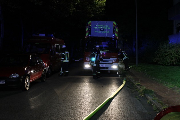 Kurz nachdem die Fahrzeuge wieder einsatzbereit waren, ertönte erneut der Meldeempfänger der Mitglieder des Löschzuges. Um 21:50 Uhr wurde mit dem Stichwort F_Heimrauchmelder in den Beckingshof alarmiert. Dort sollte im Kellergeschoss ein Heimrauchmelder ausgelöst haben. Da wie zuvor ebenfalls noch Kameraden vom Löschzug 1 und vom Löschzug 3 aus Stockum sich am Gerätehaus befanden, konnte binnen weniger Sekunden ausgerückt werden. Der zuerst eintreffende Einsatzleiter erkunde die Lage, und stellte einen beißenden angebrannten Geruch im Keller des Gebäudes fest. Der Angriffstrupp vom Hilfeleistungslöschfahrzeug verschaffte sich gewaltsam Zutritt zur Wohnung im Kellergeschoss. Die Wohnung war durch angebranntes Essen auf dem Herd stark verraucht. Der Angriffstrupp der mit schwerem Atemschutz die Wohnung nach Menschen durchsuchte, konnte insgesamt 3 schlafende Personen aus der verrauchten Wohnung retten. Diese wurden direkt zur Behandlung an den Rettungsdienst aus Werne übergeben. Aufgrund des Anzahl an Verletzten wurden weitere Rettungsmittel aus dem Kreisgebiet nach Werne beordert. 3 Personen wurden mit Verdacht auf Rauchgasintoxikation in die umliegenden Krankenhäuser eingeliefert. Nachdem die Wohnung durchsucht und keine weiteren Personen gefunden wurden, lüftet die Feuerwehr mit einem Hochdrucklüfter die Räumlichkeiten. Parallel zur Menschenrettung wurde durch die Kameraden aus Stockum und Werne eine Wasserversorgung aufgebaut sowie ein Sicherheitstrupp für den Angriffstrupp zur Verfügung gestellt. Um 22:40 Uhr war für die 40 freiwilligen Einsatzkräfte mit 7 Fahrzeugen Einsatzende. An diesem Einsatz beteiligt waren der Rettungsdienst und Notarzt aus Werne, zwei weitere Rettungswagen aus Lünen und Kamen, der leitende Notarzt, organisatorische Leiter Rettungsdienst sowie die Polizei. Wie wichtig Rauchmelder sind, zeigte dieser Einsatz deutlich. Aufgrund der frühzeitigen Alarmierung der Feuerwehr konnte hier Schlimmeres verhindert werden. Statistiken zeigen, das bis zu 90% der Brandtoten durch giftige Rauchgase starben und nicht durch die Flammen des Brandes selbst. Rauchmelder retten Leben!