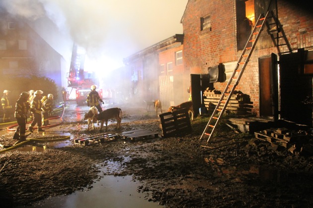 Um 19:29 Uhr wurde die Freiwillige Feuerwehr Werne zu einem vermuteten Gebäudebrand in den Ortsteil Werne-Horst alarmiert. Bereits auf der Anfahrt konnten die Einsatzkräfte den ausgedehnten Brand eines Stallgebäudes erkennen. Aktuell befinden sich über 50 Einsatzkräfte aus allen Löschgruppen und -zügen an der Einsatzstelle in der Hellstraße. Priorität lag zunächst auf der Rettung von rund 400 Mastschweinen, ca. 45 Kühen, Rindern und etwa 20 Kälbern. Diese Maßnahme ist zwischenzeitlich abgeschlossen. Umliegende Bauern helfen etwa bei der Organisation von Melk- und Unterbringungsmöglichkeiten. Ein Tierarzt wurde zur Einsatzstelle beordert.