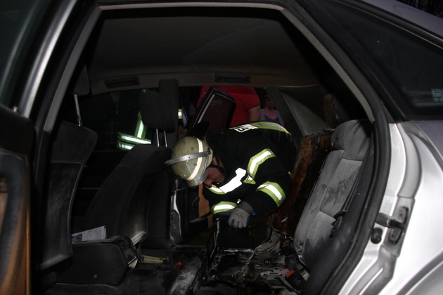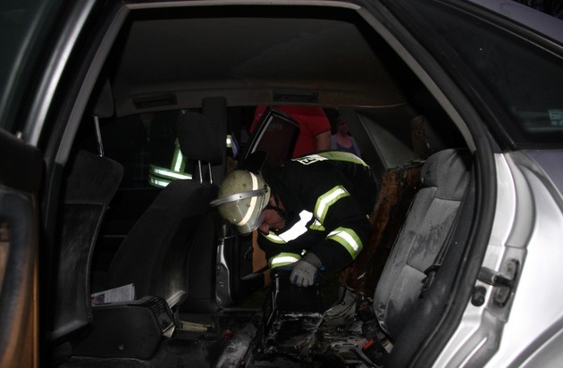 Der Löschzug 1 der Freiwilligen Feuerwehr Werne wurde um 17:09Uhr per digitalem Meldeempfänger mit dem Stichwort "FEUER_1 - Fahrzeugbrand" an die Abzweigung Hansaring B233 / Horster Straße gerufen. Da glücklicherweise der Entstehungsbrand im PKW durch einen privat verständigten und im Nahbereich wohnenden Kameraden mit einem Feuerlöscher bereits gelöscht wurde, beliefen sich die Aufgaben der Feuerwehr nur noch auf die Kontrolle des Brandbereiches mit der Wärmebildkamera. Vermutlich durch einen Kabelbrand war die hintere Sitzbank in dem PKW während der Fahrt in Brand geraten. Als Fahrer und die Beifahrerin den Brand bemerkten, konnten sie den PKW stoppen und unverletzt verlassen. Der Fahrzeugeigentümer verletzte sich bei den ersten Löschversuchen. Er wurde mit Brandverletzungen an den Händen und einer leichten Rauchgasintoxikation vom Rettungsdienst zur Behandlung in ein nahe gelegenes Krankenhaus transportiert. Die Feuerwehr entfernte die angebrannte Rücksitzbank und klemmte Aufgrund weiterer Kurzschluss- und Brandgefahr die Batterie ab bzw. baute sie aus. Für die Aufräum- und Kotrollarbeiten wurde der Kreuzungsbereich für circa 20 Minuten gesperrt. Im Anschluss entfernten die Einsatzkräfte das Fahrzeug aus dem Einmündungsbereich und schoben es mit vereinten Kräften zu einer nahe gelegenen Tankstelle. Im Einsatz waren 12 freiwillige Kräfte mit drei Fahrzeugen, der Rettungsdienst sowie die Polizei aus Werne.