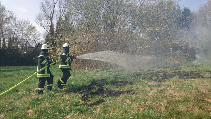Länger dauerte der Einsatz am Dornberg. Bei Eintreffen nahmen Anwohner die Einsatzkräfte in Empfang und wiesen den Gruppenführer ein. Ein Flächenbrand mit rund 200 m² Ausdehnung konnte mit Hilfe eines C-Rohrs schnell eingegrenzt und gelöscht werden. Da mehrere kleinere Brandstellen während der Löscharbeiten gefunden wurden, erhielt ein Trupp den Auftrag, ein nahes Waldstück um den Schützenplatz am Dornberg nach weiteren Glutnestern abzusuchen. Zudem gab es Hinweise aus der Nachbarschaft, dass es im Waldstück auch brennen würde. Die Einsatzkräfte wurden schnell fündig und legten eine Schlauchleitung vom Dornberg bis zum Schützenplatz. Auch hier konnte die ca. 200 m² große Waldfläche schnell unter Kontrolle gebracht werden. Das Legen der Schlauchleitung sowie die Aufräumarbeiten beschäftigten die 16 Einsatzkräfte allerdings gut zwei Stunden. Für diese Zeit war der Dornberg gesperrt.