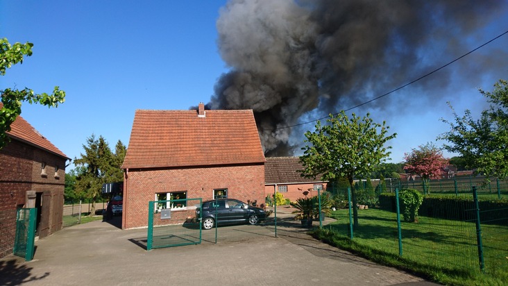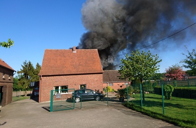 Um 17:56 Uhr wurde der Löschzug 1 und die Löschgruppe 4 der Freiwilligen Feuerwehr zum Brand einer Gartenhütte mit dem Stichwort Feuer_2 in die Bauernschaft Holthausen alarmiert. Bereits auf der Anfahrt konnte die Einsatzkräfte eine tiefschwarze Rauchwolke erkennen, die vom Vollbrand einer kleineren Scheune kündete, in der unter anderem Kaminholz gelagert war. Diese war aus unbekannter Ursache in Brand geraten. Mit zwei C-Rohren wurde die Brandbekämpfung unmittelbar nach Eintreffen begonnen.
