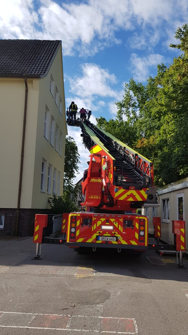 Was war passiert? Mit Martinshorn und Blaulicht fuhren ein Tanklöschfahrzeug und eine Drehleiter der Freiwilligen Feuerwehr Werne am Montagmorgen den 09.07.2018 auf den Schulhof der Katholische Wiehagengrundschule und der Wienbrede Grundschule. Während des Unterrichtes hatte der Feueralarm in den Schulen ausgelöst und Lehrkräfte wie auch Schüler mussten umgehend das jeweilige Klassenzimmer in Richtung der vorher definierten Sammelstellen verlassen.