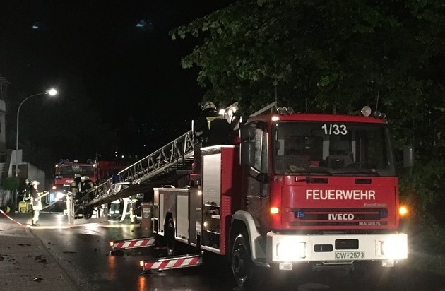 Gegen 21:50 Uhr wurde die Freiwillige Feuerwehr zu einem Großbrand in Nagold alarmiert. Anwohner meldeten zu diesem Zeitpunkt einen offenen Dachstuhlbrand nach einem vermutlichen Blitzeinschlag mit Personen im Gebäude. Aufgrund dieser Meldung wurde für die Feuerwehr und den Rettungsdienst Gesamtalarm ausgelöst. Bereits wenig später trafen die ersten Einsatzkräfte der Feuerwehr Nagold am Einsatzort in der Emminger Straße ein. Hier wurde die Feuerwehr informiert, dass sich glücklicherweise alle Bewohner des Hauses in Sicherheit bringen konnten und keine Personen mehr im Gebäude sind. Der vordere Bereich des Dachstuhls brannte zu diesem Zeitpunkt und die Flammen waren am Nachthimmel sichtbar. Gleichzeitig wurden zur Unterstützung die Feuerwehren aus den Abteilungen Emmingen und Gündringen an den Einsatzort gerufen. Von der Drehleiter aus wurde die Brandbekämpfung mit einem B-Rohr vorgenommen und einige Trupps übernahmen den Innenangriff im Gebäude. Insgesamt befanden sich sieben Trupps unter Atemschutz im Einsatz. Nachdem der Brand gelöscht war wurden die Wohnungen und das Dach mit einer Wärmebildkamera kontrolliert und der Einsatz war für die Feuerwehren nach Mitternacht beendet.