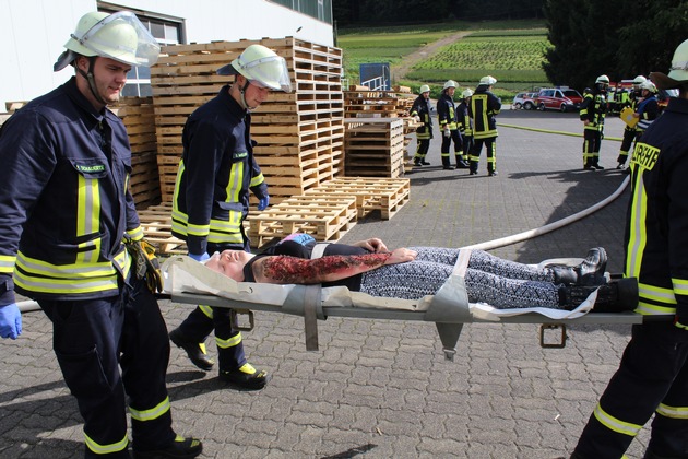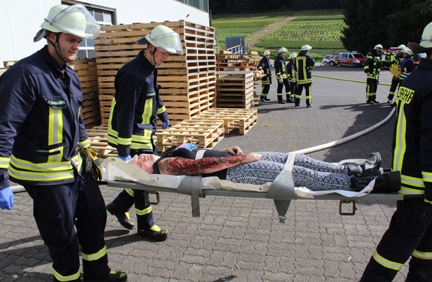 Am vergangenen Samstag gegen 14:10 Uhr wurde die Löschgruppe Kirchhundem nach Würdinghausen zur Firma dehonit® Deutsche Holzveredelung Schmeing alarmiert. Hier sollte es im Bereich der Holzfertigung und Schlosserei brennen. Nachdem das erste Löschfahrzeug eingetroffen und der Gruppenführer die Lage erkundet hatte, stellte sich heraus, dass es im vorderen Bereich der Fertigung zu einer Verpuffung an einer Maschine gekommen war und die komplette Fertigungshalle verraucht war. Laut Aussage eines Mitarbeiters würden sich noch 5-7 Personen in dem betroffenen Bereich befinden. Durch die Kraft der Verpuffung fielen mehrere Stahlrohre und eine Stahlplatte, welche hinter der Schlosserei gelagert wurden, um und begruben einen Mitarbeiter unter sich. Sofort wurde eine Alarmstichworterhöhung auf "Feuer 3 mit Menschenleben in Gefahr" durchgeführt. Auf Grund dieser Lage wurden alle neun Einheiten der Freiwilligen Feuerwehr der Gemeinde Kirchhundem, sowie die Rettungsdienstunterstützungseinheit Lenne zum Unglücksort alarmiert. Mit mehreren Atemschutztrupps und über zwei Zugänge wurden insgesamt sechs Verletzte Personen, teilwiese mit Verbrennungen und offenen Brüchen, aus der Fertigungshalle gerettet und von der alarmierten Unterstützungseinheit behandelt. Die verunglückte Person unter den Stahlrohren wurde von zwei Löschgruppen unter Hilfenahme von Hochdruckhebekissen und weiterem technischen Hilfsmittelen befreit und ebenfalls an die Unterstützungseinheit übergeben. Aufgrund der Anzahl der Verletzten wurde eine Patientenablage eingerichtet. Glücklicherweise handelte sich es bei diesem Szenario um eine Alarmübung aller Einheiten der Freiwilligen Feuerwehr der Gemeinde Kirchhundem, die einmal im Jahr durchgeführt wird. Um der Rettungsdienstunterstützungseinheit Lenne eine realistische Patientenversorgung zu simulieren, unterstützte die DLRG diese Übung mit einem Team zur Realistischen Unfalldarstellung (RUD-Team), welche alle Verletzungen täuschend echt darstellte. Im Einsatz befanden sich ca. 90 Einsatzkräfte. Ein ganz besonderer Dank gilt der Firma dehonit® Deutsche Holzveredelung Schmeing GmbH & Co. KG für das Bereitstellen der Übungsmöglichkeiten, so das eine sehr realistische Übung durchgeführt werden konnte. Ein weiterer Dank geht an das Organisationsteam um Peter Grotmann und Volker Bankstahl die diese Übung vorbereitet haben.