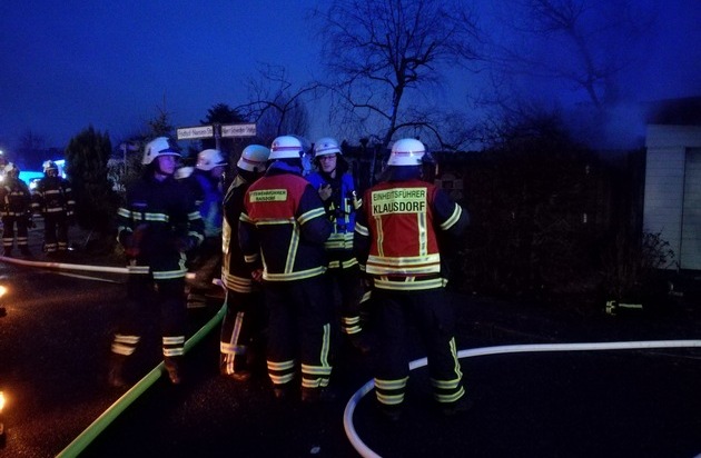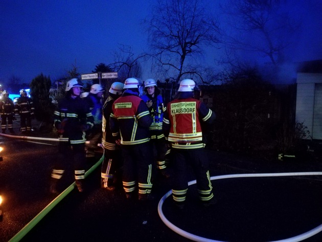 Am Donnerstag, den 21.12.2017 um 07:22 Uhr, wurden die Feuerwehren der Stadt Schwentinental in den Ortsteil Raisdorf unter dem Stichwort FEU zu einem Garagenbrand alarmiert. Bei dem Eintreffen am Einsatzort, konnte bereits eine massive Rauchentwicklung im Bereich des Garagengebäudes festgestellt werden. Eine umfangreiche Erkundung durch den ersteintreffenden Einsatzleiter, Herr Stefan Kühl, ergab eine Rauchentwicklung innerhalb eines Garagenkomplexes. Durch sofort eingesetzte Trupps unter umluftunabhängigem Atemschutz wurde umgehend ein Löschangriff zum Schutz des benachbarten Wohngebäudes, sowie einen angrenzenden Geräteschuppen eingeleitet. Als große Schwierigkeit erwies sich das Betreten der Garage. Diese musste unter Zuhilfenahme von einer Rettungssäge gewaltsam durch das Garagentor betreten werden. Innerhalb der Garage wurde ein PKW, sowie eine große Menge an gelagertem Brennholz vorgefunden. Parallel zu dem Vorgehen in die Garage, wurde durch einen weiteren Zugang im rückwertigem Bereich des Garagenkomplexes, bereits durch Einsatzkräfte unter Atemschutz die Brandbekämpfung eingeleitet. Im Laufe des Einsatzes stellte sich heraus, das sich im hinteren Teil des Gebäudekomplexes eine Art Lagerraum befand, welcher bautechnisch von der Garage getrennt war. In dem Bereich des Lagerraums konnte letztendlich auch der Brandherd ausgemacht und bekämpft werden. Im weiteren Verlauf des Einsatzes übernahm der stellv. Ortswehrführer der Feuerwehr Raisdorf, Herr Dr. Lutz Johannsen, die Einsatzleitung. Der ursächliche Brand konnte nach ca. 60 min durch die Feuerwehren Raisdorf und Klausdorf gelöscht werden. Die Nachlösch- und Aufräumarbeiten durch die Feuerwehr nahmen weitere knapp 2 Std. in Anspruch, da sich die Nachlöscharbeiten durch Glutnester in der Zwischendecke als zeitintensiv erwiesen. Um die Einsatzbereitschaft der Feuerwehren sicherzustellen, wurde die Feuerwehrtechnische Zentrale mit Ersatzmaterial an die Einsatzstelle beordert.