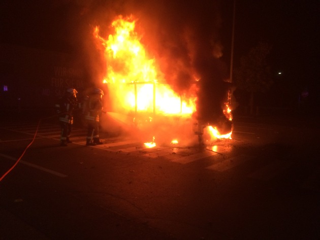 Beim Eintreffen der Einsatzkräfte stellte sich heraus, dass ein Abstellhaus für Einkaufswagen in voller Ausdehnung brannte.