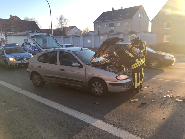 Bei Eintreffen der Feuerwehr stellte sich heraus, dass das Fahrzeug nicht brannte, sondern aufgrund des Unfalls die Batterie des Fahrzeuges beschädigt wurde und geschmort hat.
