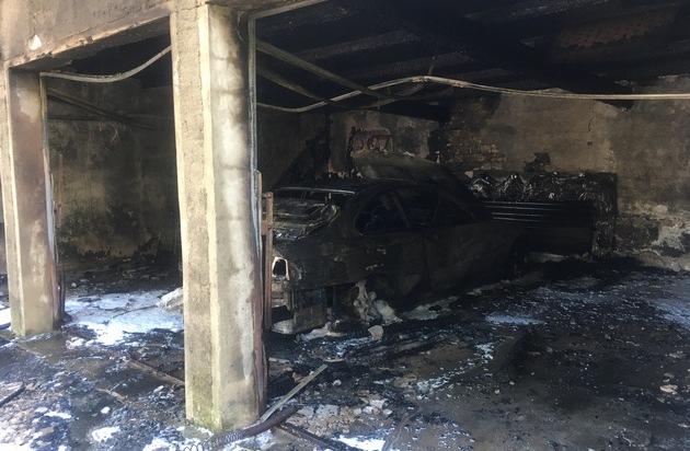 In einer Garage war ein Fahrzeug in Brand geraten. Ein weiterer in der Garage abgestellter PKW konnte vom Besitzer noch rechtzeitig in Sicherheit gebracht werden.