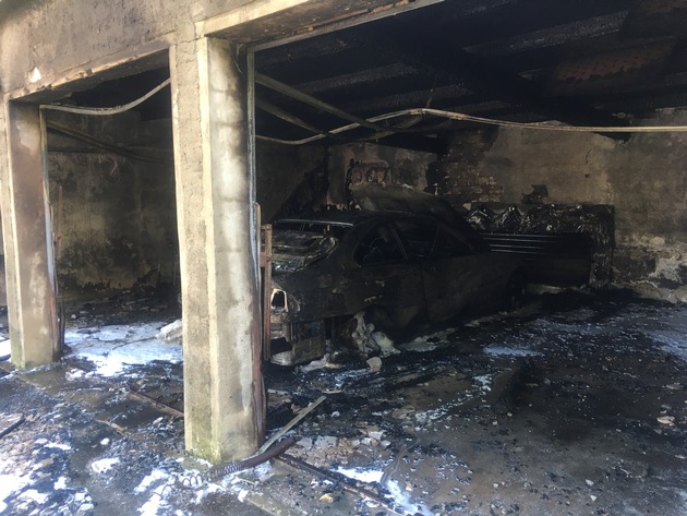 In einer Garage war ein Fahrzeug in Brand geraten. Ein weiterer in der Garage abgestellter PKW konnte vom Besitzer noch rechtzeitig in Sicherheit gebracht werden.