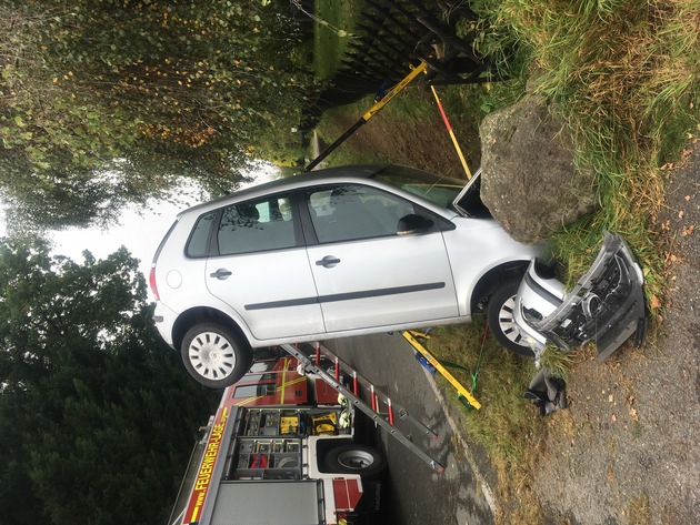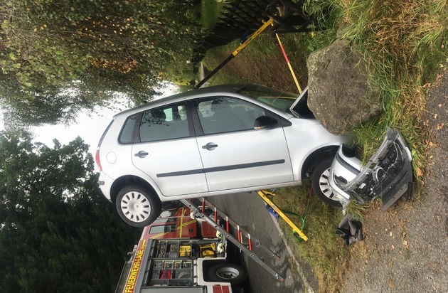 FW Lage: Alleinunfall eines PKW - aufwendige Rettung der verletzten Fahrerin