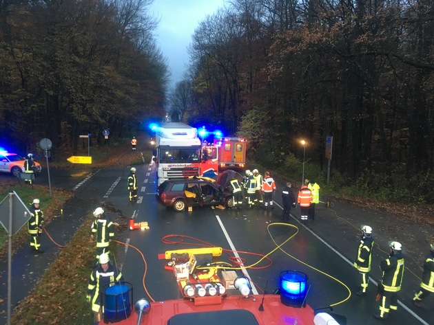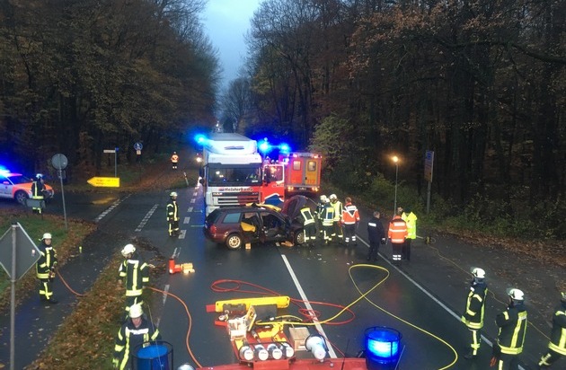 Um 07:20 Uhr heute Morgen wurden die Löschzüge Lage und Kachtenhausen der Freiwilligen Feuerwehr Lage zusammen mit dem Rettungsdienst des Kreises Lippe unter dem Stichwort "Person eingeklemmt, VU Pkw gegen Lkw, 2 Verletzte" zur Bielefelder Straße in Höhe der Einmündung Billinghauser Straße alarmiert. Dort wollte die Fahrerin eines Audi aus der Seitenstraße auf die Bielefelder Straße einbiegen und wurde von einem herannahendem Sattelzug auf Höhe der Fahrertür seitlich getroffen. Die Fahrerin wurde schwer verletzt und war im Fußbereich eingeklemmt. Die Beifahrerin erlitt leichte Verletzungen, konnte das Fahrzeug aber eigenständig verlassen. Nach erfolgter Erstversorgung durch den Rettungsdienst, der mit 3 Rettungswagen und 2 Notarzteinsatzfahrzeugen vor Ort war, wurde die Pkw-Fahrerin von der Feuerwehr mit technischem Gerät über die Fahrerseite aus ihrem Fahrzeug befreit. Anschließend wurde sie vom Rettungsdienst in ein Krankenhaus gebracht, die leicht verletzte Beifahrerin ebenfalls. In den Rückstaus, die sich beidseits der Unfallstelle gebildet hatten, standen unter anderem 2 Linienbusse, die zum großen Teil mit Schülern besetzt waren. Die Busse wurden beim Wenden ihrer Fahrzeuge durch Polizei und Feuerwehr unterstützt, damit sie ihre Fahrt über die Umleitungsstrecken fortsetzen konnten. Anschließend konnten auch die übrigen Pkw wenden. Die Polizei sperrte die Unfallstelle weiträumig und leitete den weiteren Verkehr um die Einsatzstelle herum. Feuerwehr und Rettungsdienst waren mit etwa 35 Einsatzkräften vor Ort, nach gut 1 1/2 Stunden war der Rettungseinsatz beendet, der Rüstwagen der Feuerwehr unterstützte anschließend noch die Polizei bei der Absperrung für die Unfallaufnahme und bei der Fahrbahnreinigung nach dem Abtransport der Unfallfahrzeuge.