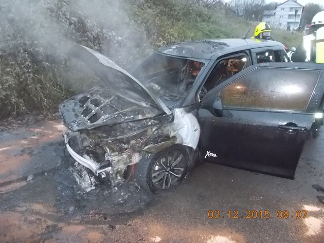 Polizei und Feuerwehr wurden gegen 07:40 Uhr über einen brennenden PKW in der Zeilbäumerstraße informiert. Vor Ort konnte ermittelt werden, dass ein PKW Suzuki Swift, kurz nachdem der Fahrer diesen zum Parken abgestellt hatte, im Motorraum in Brand geriet. Trotz schnellen Eingreifens der Feuerwehr wurde der PKW total beschädigt. Durch die Hitzeentwicklung wurde noch ein vor dem brennenden PKW abgestellter Ford Fiesta in Mitleidenschaft gezogen. Der entstandene Schaden beläuft sich auf ca. 18.500 Euro.