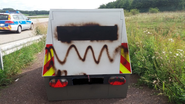 Ein aufmerksamer Verkehrsteilnehmer meldete am Sonntagmorgen, 20.08.2017, dass die mobile Geschwindigkeits-Messanlage (Enforcement-Trailer) an der L700 zwischen Hornbach und dem Flugplatz Zweibrücken mit Farbe beschmiert wurde. Die Verkleidung des auch so genannten Blitzer-Anhängers, das Kennzeichenschild, die beiden Rückleuchten sowie die Scheibe der Messeinrichtung wurden mit brauner Farbe besprüht. Somit war die Messanlage nicht mehr funktionsfähig. Die Ermittlungen dauern an.