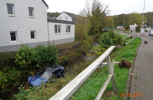 Ein Leichtverletzter und ca. 8000 Euro Sachschaden ist die Bilanz eines Verkehrsunfalls, der sich gestern gegen 11:00 Uhr in der Sickingerhöhstraße ereignete. Dort kam ein 18-jähriger PKW-Fahrer vermutlich in Folge nicht angepasster Geschwindigkeit in Fahrtrichtung Oberauerbach nach rechts von der Fahrbahn ab, durchbrach ein am Gehweg aufgestelltes Geländer, überschlug sich in der angrenzenden abschüssigen Böschung und landete schließlich total beschädigt in dem Auerbach. Der 18-jährige konnte sich leicht verletzt aus seinem PKW selbst befreien; er wurde in ein Krankenhaus eingeliefert. Sein Auto musste abgeschleppt werden.