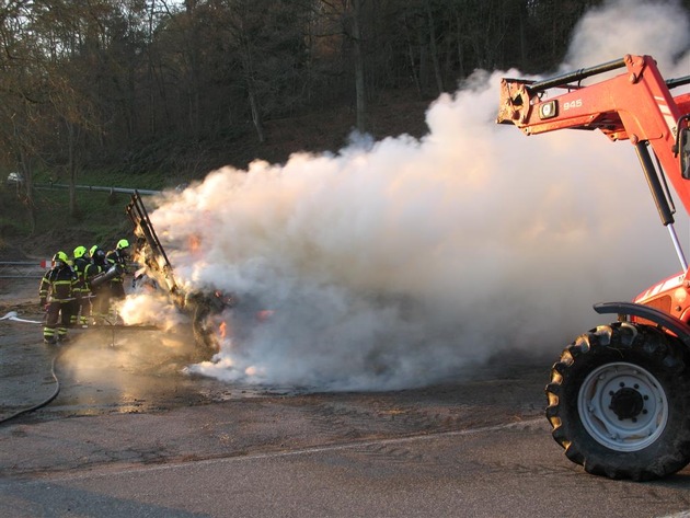 Zwischen Maßweiler und Thaleischweiler-Fröschen in Höhe der Faustermühle brannte am Donnerstagnachmittag ein landwirtschaftlicher Anhänger. Der Anhänger war beladen mit 17 großen Strohballen. Wie der Besitzer mitteilte, war er mit seinem Traktor und der Ladung unterwegs nach Thaleischweiler-Fröschen, als er plötzlich Rauch aus dem Stroh aufsteigen sah. Glücklicherweise konnte er das Gespann auf ein an die Straße angrenzendes Wiesengrundstück lenken und die Zugmaschine abhängen, so dass zumindest diese vom Feuer unversehrt blieb. Feuerwehren aus Thaleischweiler-Fröschen, Rieschweiler-Mühlbach und Wallhalben waren kurze Zeit nach der Brandmeldung mit 7 Einsatzfahrzeugen und 30 Kräften vor Ort. Sie brauchten zur Löschung des Brandes mehrere Stunden. So war auch die Landstraße für 2 Stunden für den Durchgangsverkehr gesperrt. Wie vom Eigentümer zu erfahren war, entstand ein Schaden in Höhe von ca. 4000.- Euro. Verletzt wurde niemand.