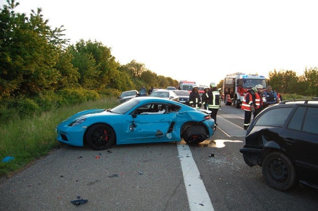 Eine Streife der Polizeiinspektion Zweibrücken wurde am 20.05.2018 gegen 19.55 Uhr auf die BAB 8 Kurz nach der Anschlussstelle Contwig zu einem Unfall (ein PKW war über eine verlorene Holzpalette gefahren) gerufen. Die Unfallstelle wurde mittels Blaulicht abgesichert. In den dadurch entstandenen Rückstau fuhren ein Porsche und ein Mercedes AMG vermutlich mit viel zu hoher Geschwindigkeit in das Stauende. Hierbei stellte sich der blaue Porsche auf der rechten Fahrspur quer und prallte mit dem Heck gegen das vor ihm stehende Fahrzeug. Der auf der linken Fahrspur fahrende Mercedes konnte nicht mehr bremsen, prallte auf den vor ihm stehenden PKW und schob diesen auf einen weiteren davor stehenden PKW. Durch die Wucht flog der silberne Mercedes über diese beiden PKW, rutschte an der Leitplanke entlang gegen einen weiteren PKW. Sieben Personen wurden hierbei verletzt und in die umliegenden Krankenhäuser gebracht. Aktuell besteht für keinen der beteiligten verletzten Personen Lebensgefahr. Die A 8 war bis etwa 03.00 Uhr gesperrt. Die Schadenshöhe wird auf etwa 150.000 bis 200.000 Euro geschätzt. Der Unfall wurde durch die Polizei Waldfischbach aufgenommen. Ein Gutachter und die Staatsanwaltschaft wurden eingeschaltet.