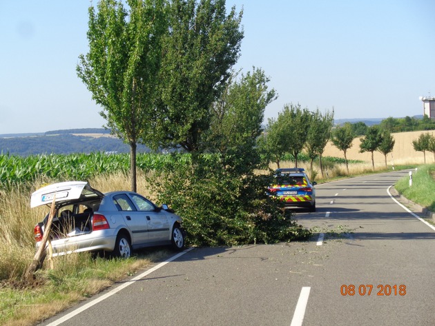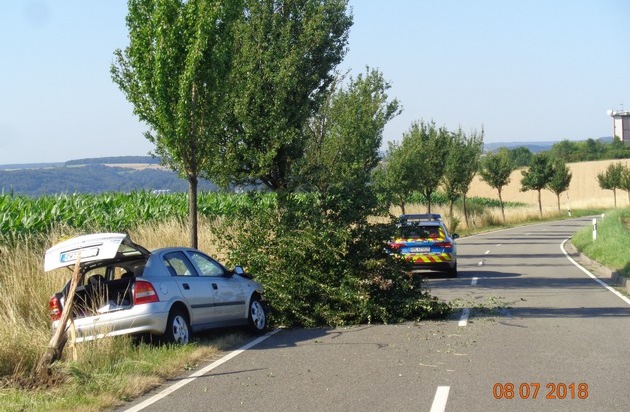 Am Sonntag gegen 09.00 Uhr befuhr ein 19-jähriger Zweibrücker die K4 in Fahrtrichtung Kreuzberg / Hochschule. Infolge Trunkenheit, THC-Einfluss und nicht angepasster Geschwindigkeit kam er nach links von der Fahrbahn ab, prallte gegen einen Leitpfosten und anschließend gegen einen am linken Fahrbahnrand stehenden Obstbaum. Durch den Aufprall wurde der Stamm des Baumes abgerissen. Am Pkw entstand wirtschaftlicher Totalschaden (ca. 2000 Euro). Der junge Mann erlitt glücklicher Weise lediglich Schürfwunden. Sein Führerschein wurde beschlagnahmt, ihm wurde eine Blutprobe entnommen und es wird ein Verfahren gegen ihn eröffnet.