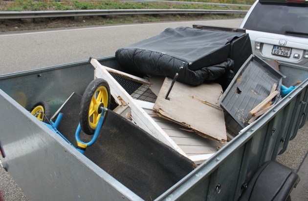Am Montagmorgen löste sich auf der A62 die Ladung eines Anhängers. In Höhe des Parkplatzes "Heidekornrech" fielen Teile der nicht gesicherten Ladung von der Ladefläche auf die Fahrbahn. Nachdem mehrere Verkehrsteilnehmer die Gefahrenstelle mitgeteilt hatten, konnte der 27 jährige Fahrer des Gespanns an der genannten Örtlichkeit durch Beamte der Autobahnpolizei Kaiserslautern angetroffen werden. Er hatte bereits selbstständig ein zerfahrenes Möbelstück von der Autobahn geräumt. Gegen den Fahrer wurde ein Bußgeldverfahren eingeleitet. Die Weiterfahrt wurde ihm untersagt.