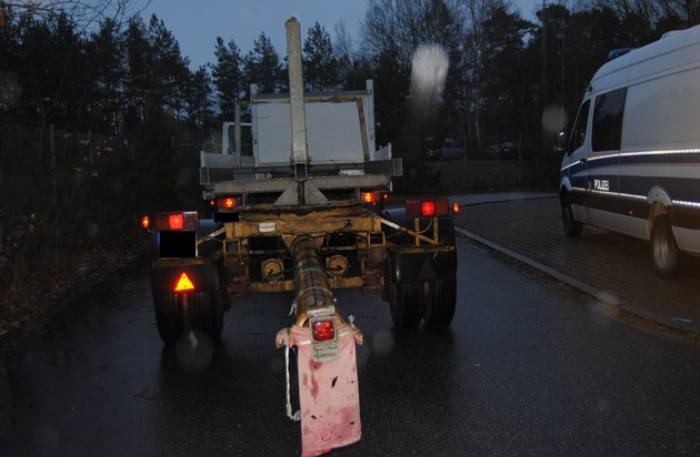 Am Donnerstagnachmittag kontrollierten Beamte der Schwerverkehrsüberwachung der Autobahnpolizei Kaiserslautern einen auffällig beladenen Lkw mit Anhänger. Die Ladung, bestehend aus einem Metallrohr ragte ohne ausreichende Sicherung zwei Meter über das Heck des Anhängers hinaus. Während der Kontrolle stellten die Spezialisten mit Entsetzten fest, dass die Fahrzeugkombination erhebliche Mängel aufwies. Die Bremsleitung der Druckluftbremsanlage war unzulässiger Weise repariert worden und wies eine Schadstelle auf, wodurch der Bremsschlauch hätte jederzeit platzen können. Die Beleuchtungseinrichtungen funktionierten ebenfalls nicht ordnungsgemäß. Weiterhin war die Frist zur Anmeldung zur Hauptuntersuchung (TÜV) um mehr als zwei Monate überschritten und zwei Unterlegkeile fehlten. Dem Fahrer wurde die Weiterfahrt untersagt. Gegen ihn und den Halter der Fahrzeugkombination wurden mehrere Bußgeldverfahren eingeleitet.