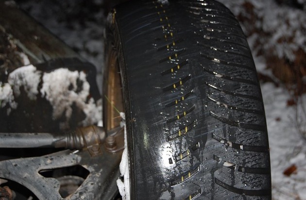 Eine 47-jährige PKW-Fahrerin befuhr am 25.11.15 die L 394 von Sippersfeld in Richtung Neuhemsbach. Infolge abgefahrener Winterreifen, schneebedeckter Fahrbahn und nicht angepasster Geschwindigkeit kam sie mit ihrem PKW von der Fahrbahn ab, überschlug sich und landete im Straßengraben. Am PKW entstand wirtschaftlicher Totalschaden, die Fahrerin wurde leicht verletzt mittels Rettungswagen in ein Krankenhaus verbracht. Bei der Unfallaufnahme wurde festgestellt, dass die Winterreifen weniger als 1,6 mm Profiltiefe hatten und teilweise "glatt" gefahren waren. Die für Schnee und Eis wichtigen kleinen Zacken fehlten in den Profilblöcken.