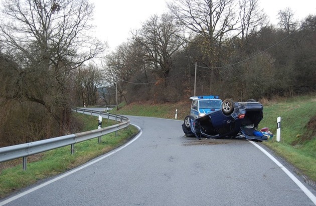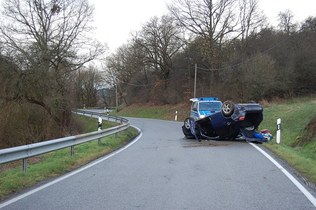 Nur leicht verletzt ist der 35 jährige Fahrer am Dienstagnachmittag aus dem auf dem Dach liegenden PKW herausgeklettert. Der PKW dürfte total beschädigt sein. Die Polizei schätzt den wirtschaftlichen Schaden auf 10.000 Euro. Auf der L 382 von Reipoltskirchen in Richtung Hefersweiler fahrend, kam der Mann in einer scharfen Linkskurve nach rechts von der Straße ab. Er übersteuerte hierauf den Wagen und schleuderte über die Fahrbahn hinweg in die Böschung auf der linken Seite. Das Fahrzeug überschlug sich dort und blieb auf der Straße liegen. Bis zur Bergung durch einen Abschleppdienst war die Landesstraße zeitweise gesperrt.